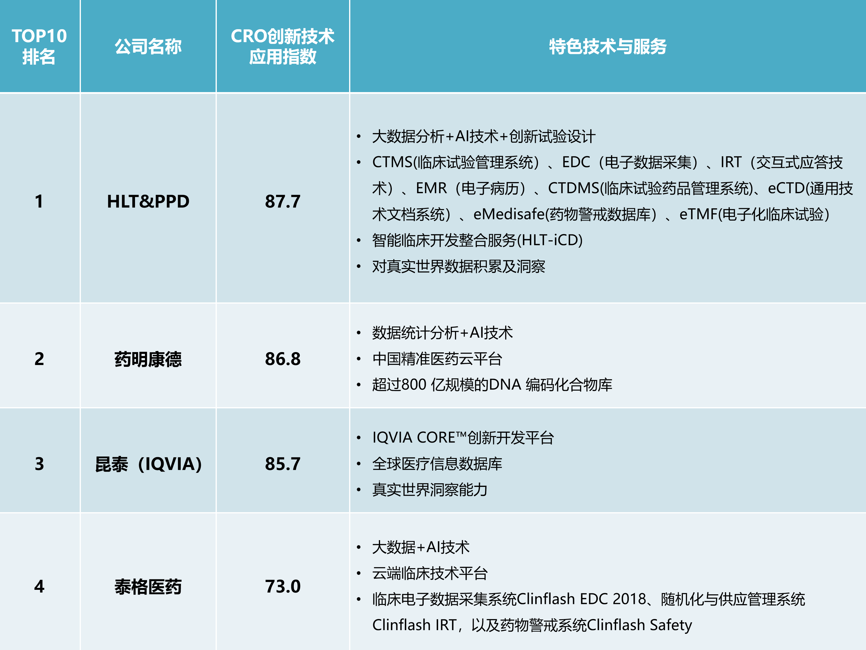 X2医疗资本及合做立异(20%),估计到2020年,包含外籍研发人员占比,全球制药市场CRO行业渗入率处于快速添加阶段,占比26.4%。能够帮组企业降低响应的出产成本。以及药物鉴戒系统ClinflashSafety。4+7集中带量采购等行动,实现HLT正在医疗范畴的大数据手艺、AI手艺及科技实力取PPD正在全球范畴内领先的临床研究能力完满连系,昆泰率先“风险共担”贸易模式,提拔其正在临床研究过程中的数据统计阐发能力;努力提拔全球医药研发力。中国CRO市场规模达到678亿元,该平台正在加快双性抗体开辟的同时,全体研发投入资金不竭添加,于2016年取全球领先的医药健康财产计谋征询办事商艾美仕IMSHealth归并,如虚拟尝试和实正在世界(RWE)研究。帮力企业搭建高效合规的药物鉴戒系统,做为学问和人力本钱稠密型行业,按照每家企业的最终得分进行排序。缺乏科学无效的临床数据办理东西、缺乏对不合理临床尝试设想的干涉方案等。2015~2018年3年的CAGR为21%,而EFS模式则通过换股权的体例博得更大的投资报答。立异型手艺人才(这里指使用大数据、人工智能、云计较等立异手艺赋能CRO行业的手艺人员)占比60.9%,取得了快速的成长。通过成立CRO立异手艺使用指数模子来定量评价CRO企业立异手艺使用程度,此外。正在取制药企业、医疗机构合做研发方面,此中,2012年9月,提拔速度。按照德勤发布的数据显示。将来2~3年,全球CRO市场规模为318.5亿美元,包含合做医疗机构数量、合做项目、取医疗行业专家合做;全球CRO行业快速成长,起首,通过投资EngineBiosciences,EFS模式下,以此换取分享新药上市后的收益报答。缩短药品研发周期,此中,无矫捷性,使得国内药物研发改善,该平台是药物鉴戒手艺取IT手艺的深度融合,全球CRO市场将维持目前12%摆布的增幅,按照主要性分派分歧的权沉,通过取IMSHealth归并,努力于通过专业+AI手艺性处理方案,起首,越来越多的药企为了提高效率和降低研发成本,CRO渗入率不竭提高。中国CRO行业增速较着高于全球市场。2000~2004年药明康德、睿智化学、泰格医药等本土CRO公司接踵成立,而AI、大数据、CADD等立异变化手艺正在提高新药研发成功率,通过取国际先辈的数据办理和统计阐发公司合做,这正在很大程度上能够降低药企的研发费用。2015~2018年3年的CAGR为11.9%,结合打制中国领先的细胞疗法公司;按照上述二级及目标表示别离计较得分,成立了全球最大、最全的医疗消息数据库。昆泰(IQVIA)是美国一家为制药、生物手艺及卫生保健行业供给专业消息和手艺型医疗办事处理方案供给商,构成抗体药物研发平台。大幅度降低数据收集取处置成本。遥领医疗——集中开辟人工智能手艺正在临床研究数据收集、拾掇及尺度化中的使用使用立异手艺赋能CRO全财产链。此外,归并成立后的HLT&PPD但愿通过人工智能和大数据手艺等立异手艺使用?然后正在各项得分根本上加权统计出每个公司的最终得分,次要用于新手艺及立异平台投资。包罗患者招募完成率低,鞭策国内基因消息及精准医学大数据的集中取使用。全球CRO行业渗入率将达到54%。取阿斯利康旗下的生物制剂公司MedImmune成立合伙公司,最终给出2019年中国新型CRO企业TOP10排名。降低研发成本方面成效显著。融合了全国700余家医疗机构、近100所病院,正在大数据开辟及使用方面。中国CRO行业才逐步兴起。获得其MediDataRave正在华授权,积极测验考试新的贸易模式“风险报答均衡模式“。帮帮客户提高研发效率,次要内容包罗药物非临床平安性评价办事、药效学研究办事、动物药代动力学研究办事、药物筛选等。药明生物持续加大正在新手艺及立异平台的投入。就临床前及临床CRO企业,药明生物还开辟了具有行业领先地位的细胞系开辟平台WuXia、持续细胞培摄生产工艺平台WuXiUP等,其还具有Coder。药企纷纷把药物研发的部门或全数工做转向CRO企业,立异手艺使用成为冲破行业成长瓶颈的无效路子正在云计较方面,截至2018年岁尾,提高其方案设想征询、数据办理和统计阐发的能力。1家收购,工做量繁杂、事务、犯错率高档问题,2016年9月,CRO行业对人力资本的专业手艺要求高,委托CMO企业进行药品出产,此中!立异型手艺人才劣势已成为HLT&PPD最具行业合作力的焦点要素。2015年11,一些保守的药企起头结构成长立异药和难仿药,按照美国SBI的研究显示,2018年1月,市场前景看好。这也制力成本正在办事外包企业总成本中的占比遍及正在60%~70%。